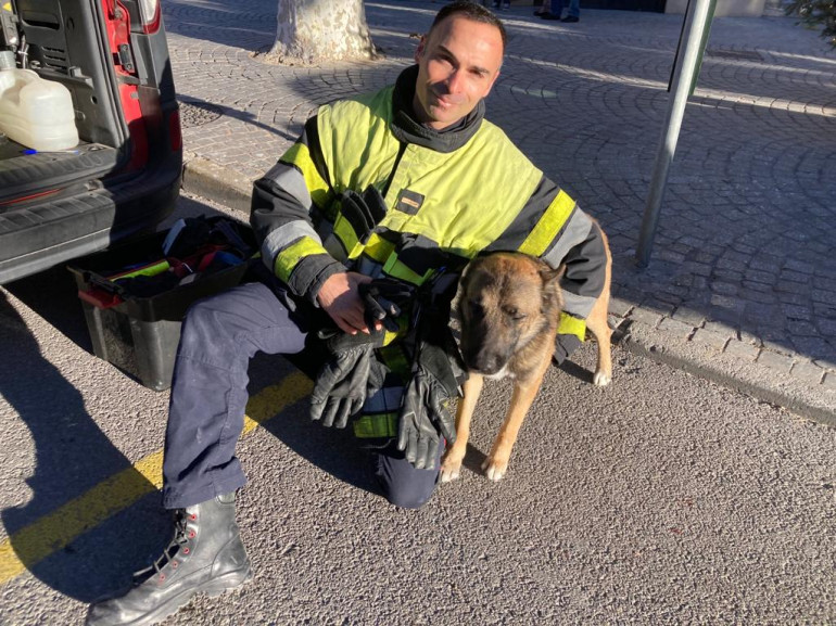 L'adjudant-chef Genovese, de l'équipe cynophile des Bouches-du-Rhône, accompagné de Paco qui a réussi à marquer le bébé dans les décombres