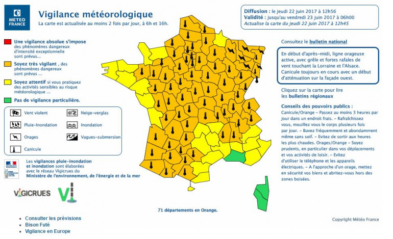 Mercredi 21 a été la journée de juin la plus chaude enregistrée en France depuis 1945, avec une moyenne nationale de 26.4° a indiqué jeudi Météo-France. Et la situation ne s'est pas améliorée jeudi, puisque météo France a placé des départements en vigilance orange canicule, portant le nombre total à 47.