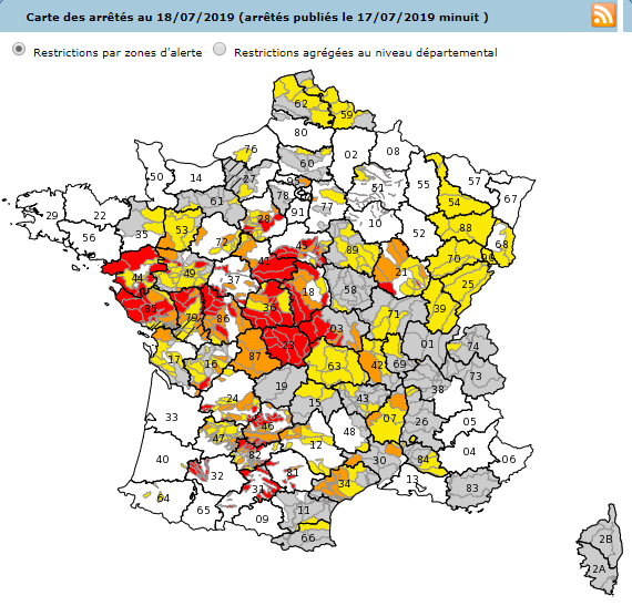 Par mesure de prévention ont été prises, les départements en alerte sont soumis à des restrictions d'eau. Pour les zones en état de "crise", tous les prélèvements non prioritaires, y compris à des fins agricoles , sont interdits. Seuls les prélèvement prioritaires (santé, sécurité civile, eau potable, salubrité), sont autorisés.