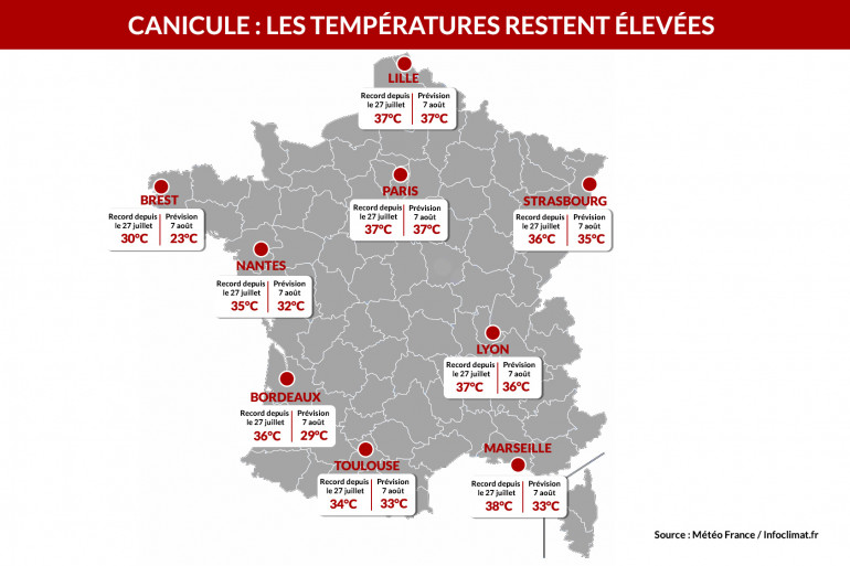 D'après Météo-France, "le pic de canicule devrait se situer lundi sur les régions du Sud-Ouest, mardi sur celles du Nord-Est, du Centre-Est et du bassin parisien". Ainsi, 36 degrés sont attendus ce lundi à Toulouse et 37 degrés à Bordeaux. Mardi 7 août, il fera 37 degrés à Paris et à Lyon. Déjà lundi dans la matinée, Météo France relevait 23 degrés à Paris, Dijon et Lyon, 24 degrés à Limoges ou Perpignan et 25 degrés dans la région niçoise.