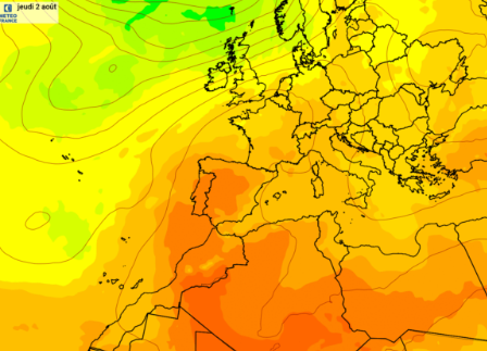 "Cet air très chaud débordera sur la moitié sud de la France à partir de jeudi (2 août) puis remontera d'ici samedi jusqu'à la moitié nord, tout en étant moins extrême que chez nos voisins ibériques" détaille Météo France. À partir de jeudi, c'est toute la moitié sud de la France qui devrait être concernée par les températures caniculaires (entre 35 et 40 degrés).