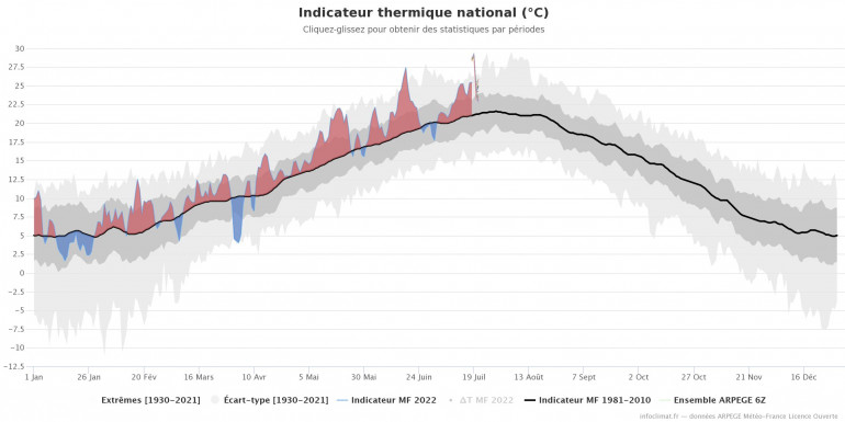 C'est l'indicateur thermique national (enregistré depuis 1947) qui permet de définir une vague de chaleur. "Un épisode de vague de chaleur est détecté dès qu'une valeur quotidienne de cet indicateur atteint ou dépasse 25,3°C", avait tweeté Météo France en 2020.