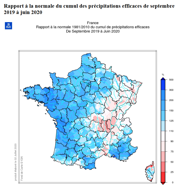 Rapport à la normal du cumul des précipitations efficaces de septembre 2019 à juin 2020
