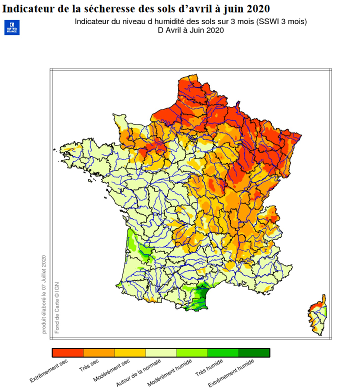 "Au 1er juillet, l'indice d'humidité des sols superficiels affiche des valeurs inférieures aux normales sur un vaste quart nord-est allant jusqu'à la Haute-Normandie et à la Sarthe ainsi que dans le centre d'Auvergne - Rhône-Alpes, explique Météo-France. Dans ces régions, le déficit atteint par endroits 30 à 40%, localement plus de 50%".