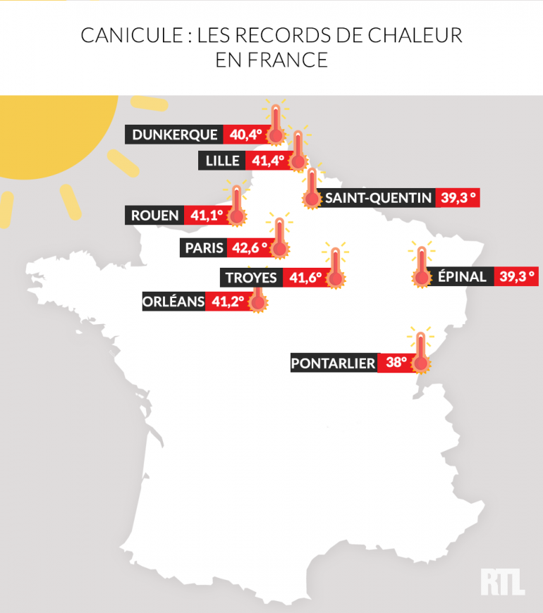 Ce jeudi a été l'une des plus chaude de l'Histoire pour la moitié nord, avec des records absolus de températures maximales battus : 42,6 degrés à Paris, 41,4 degrés à Dunkerque, 40,9 degrés à Chartres...