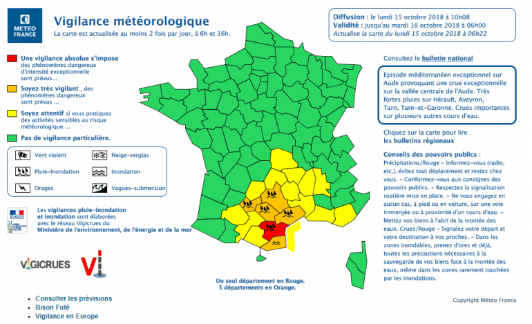 16h17 - Le département de l'Aude est toujours en vigilance rouge alors que trois départements, l'Aveyron, l'Hérault et les Pyrénées-Orientales, sont en alerte orange.