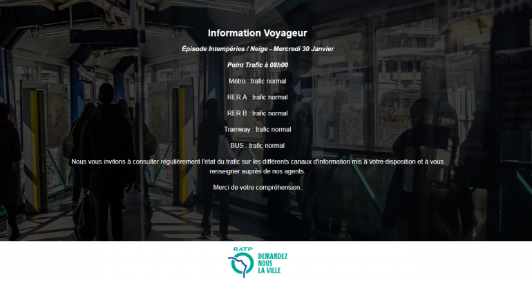 08h31 - À Paris, les transports en commun roulent ce mercredi matin. La RATP indiquait à 8 heures que les métros, les RER A et B, les tramways et les bus circulaient normalement.
