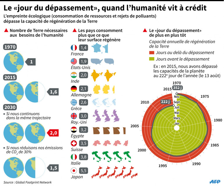 Le "jour du dépassement" ("overshoot day" en anglais) tombe cette année le 13 août, selonl'ONG internationale Global Footprint Network. Et il faudrait 1,6 planète pour subvenir aux besoins actuels de l'humanité. Global Footprint Network dresse ce bilan tous les ans, rectifiant parfois les dates annoncées les années précédentes, en raison de progrès dans sa méthodologie et de mises à jour des données. L'organisation, basée en Californie, a constaté que le "jour du dépassement" survient de plus en plus tôt chaque année, signe d'une consommation de plus en plus décalée par rapport aux ressources disponibles. En 2014, il intervenu le 17 août. En 1970, le "jour du dépassement" n'était survenu que le 23 décembre. Depuis, sa date n'a cessé de régresser : 3 novembre en 1980, 13 octobre en 1990, 4 octobre en 2000, 3 septembre en 2005, 28 août en 2010.