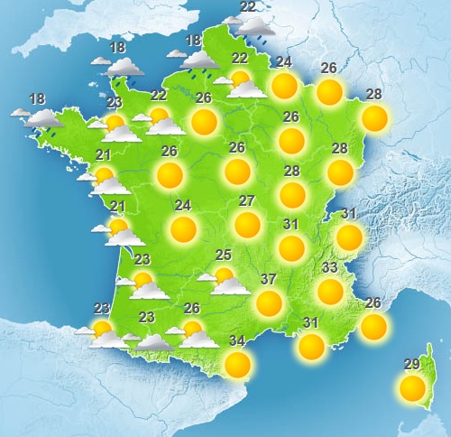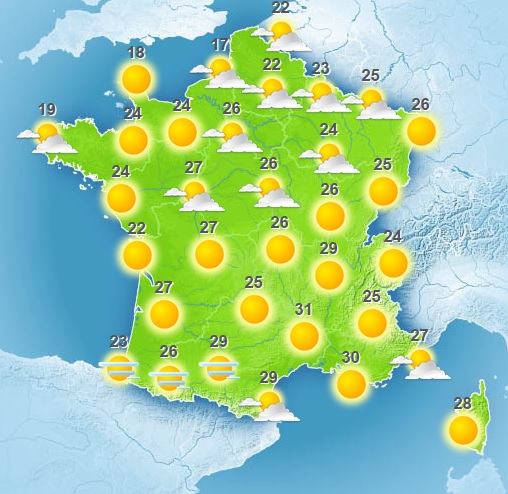 Côté températures, on aura le matin 12 à 17 degrés en général, ponctuellement 20 sur le Sud-Ouest, et 20 à 24 près de la Méditerranée. Les températures maximales atteindront 19 à 24 degrés le long de la Manche, 23 à 29 sur les trois-quarts ouest du pays, 30 à 34 sur la façade est, voire 35 à 38 vers la basse vallée du Rhône.