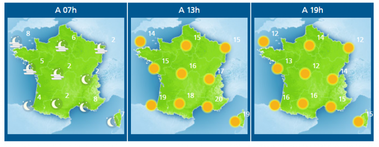 Les minimales resteront fraîches avec des gelées fréquentes entre -4 et 0 degrés du Nord-Est au Massif central, -1 à +5 degrés ailleurs en général, il fera un peu moins froid avec 3 à 9 degrés sur le Nord-Ouest et sur les régions côtières. Les maximales poursuivront leur hausse, avec 13 à 17 degrés sur l'hexagone, 18 dans le sud-ouest, 16 à 20 degrés dans le Sud-Est.