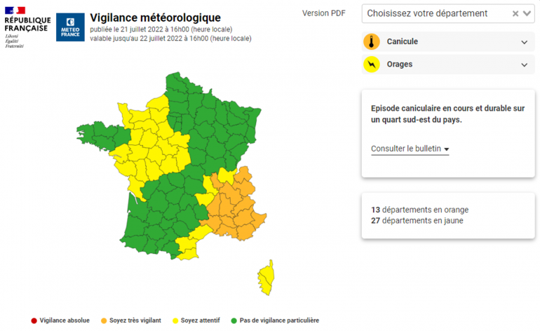 La carte de vigilance canicule du jeudi 21 juillet à 16h
