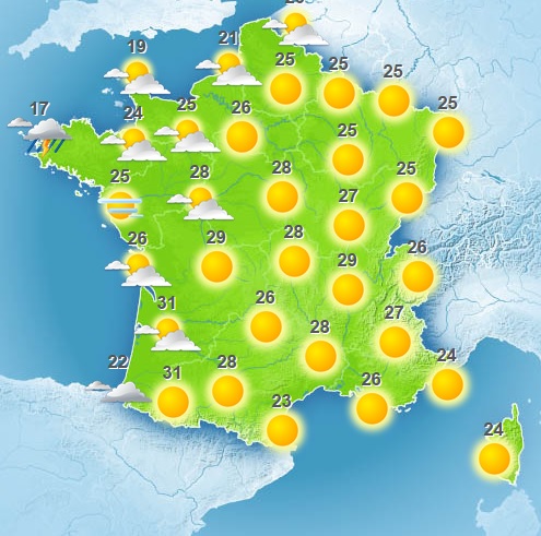 Le matin, les températures seront comprises entre 7 et 15 degrés de l'intérieur vers les côtes, jusqu'à 16 à 20 degrés près de la Méditerranée. L'après-midi, elles oscilleront entre 19 et 24 degrés sur la Bretagne et près de la Manche, 24 à 28 degrés des Pays de la Loire aux frontières du Nord, 25 à 31 degrés ailleurs, jusqu'à 32 à 34 degrés en Nouvelle-Aquitaine.
