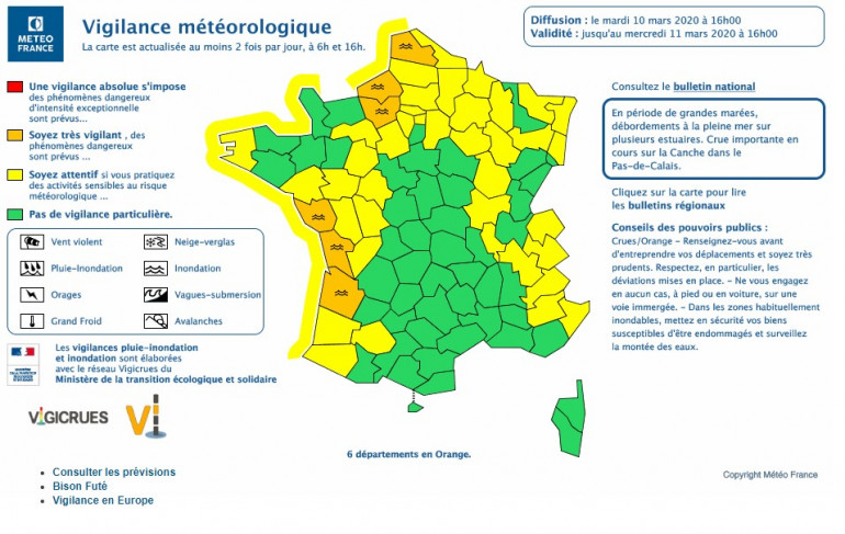 Météo France a placé six départements en vigilance orange inondation ce mardi 10 mars 2020.