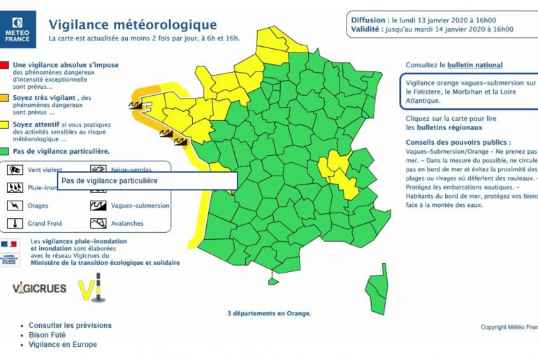 Météo-France a déclenché une alerte vigilance orange vague-submersion sur trois départements de la façade Atlantique ce lundi 13 janvier. Ainsi, le Finistère, la Loire-Atlantique et Morbihan sont soumis à un épisode de très fortes vagues nécessitant une vigilance particulière. Ceci est la répercussion sur les côtes françaises de la tempête Brendan qui circule au nord-ouest de l'Irlande.