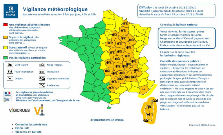 Attention au vent violent : la Corse est redescendue en vigilance orange ce lundi 29 octobre par Météo France dans son bilan de 22h10. Son littoral est quant à lui en vigilance orange pour risque de vagues-submersion.