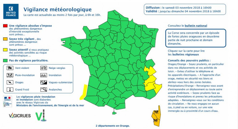 Carte de vigilance Météo France, le 3 novembre à 16h
