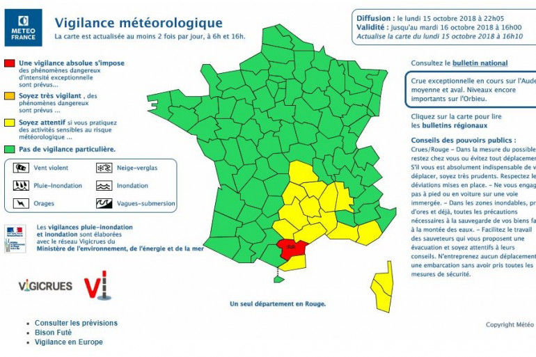 Météo France maintient l'Aude en vigilance rouge, 15 départements en jaune