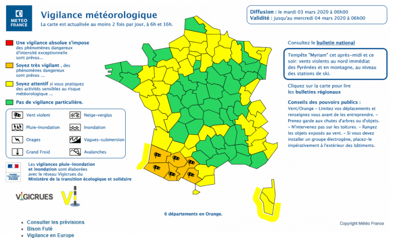 "Myriam" va circuler rapidement ce mardi du Golfe de Gascogne au Golfe du Lion. Entre le début d'après-midi et la soirée, elle provoquera des vents violents en plaine au nord des Pyrénées et en montagne. Les valeurs attendues sont de l'ordre de 120/130 km/h près des côtes basques et landaises; 100 à 110 km/h très ponctuellement un peu plus en plaine; 120/130 km/h en montagne au niveau des stations de ski, avec 150 km/h ou plus vers les cols et les sommets, indique Météo France.