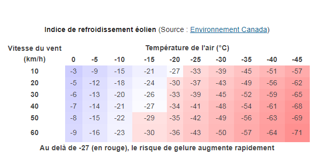 "L'indice éolien (ndlr température ressentie) est un nombre sans unité. Par une température de l'air de -10°C et un vent de 30 km/h, il sera par exemple de -20. Cela signifie que la sensation sur la peau sera voisine de celle éprouvée sous une température de -20°C par une journée sans vent", explique l'organisme.