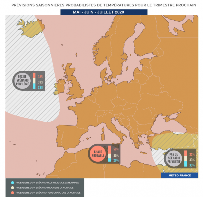 Selon les prévisions publiées par Météo France, et établies par "un groupe d'experts de Météo-France et de Mercator Ocean (le centre français d'analyses et de prévisions océaniques), le temps sera plus sec et plus chaud. L'organisme météorologique s'attend également à un déficit de précipitation.