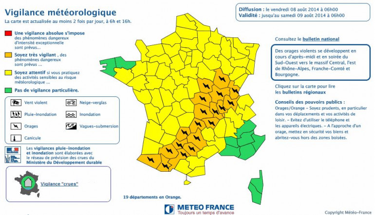 Après avoir placé initialement 19 départements en alerte oranges orages, Météo France a étendu la vigilance à 7 nouveaux départements : l'Ariège, l'Aude, la Corrèze, l'Hérault, les Landes, le Lot-et-Garonne et la Lozère.