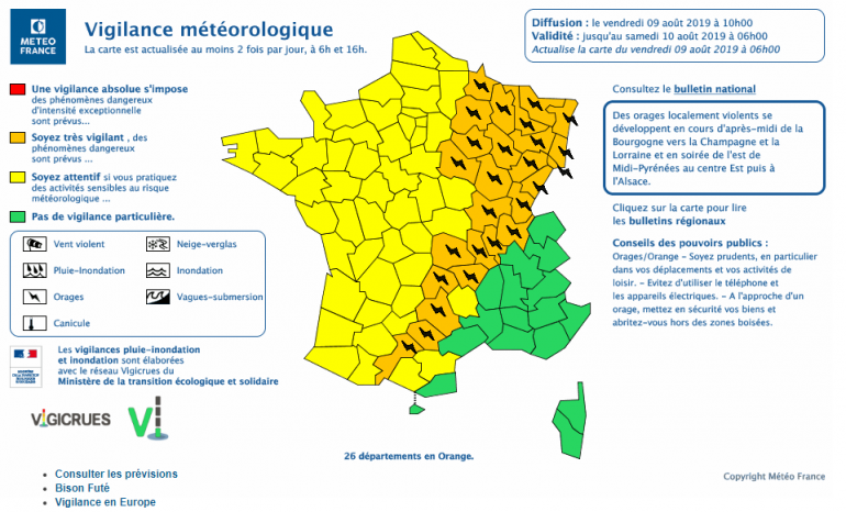 Carte de vigilance de Météo France du vendredi 9 aout 2019