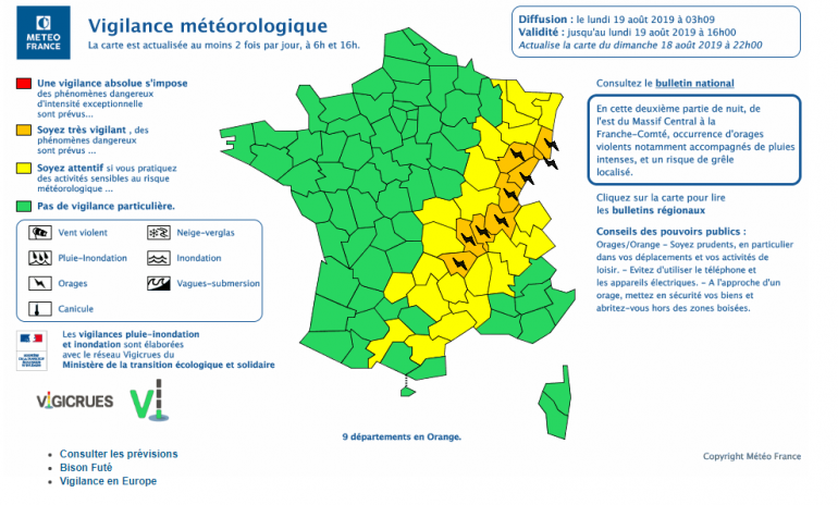 Dans son dernier bulletin publié à 3h du matin, le service de prévision a levé l'alerte pour quatre départements: la Côte-d'Or, le Bas-Rhin, la Saône-et-Loire et les Vosges en précisant que la sortie du dispositif d'alerte se faisait par la bordure ouest. L'Ain, le Doubs, le Jura, la Loire, la Haute-Loire, le Haut-Rhin, le Rhône, la Haute-Saône, et le Territoire de Belfort sont maintenus en vigilance orange jusqu'à 6h du matin.