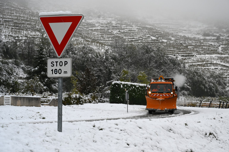 Une déneigeuse nettoie les routes à côté de Tournon-sur-Rhone