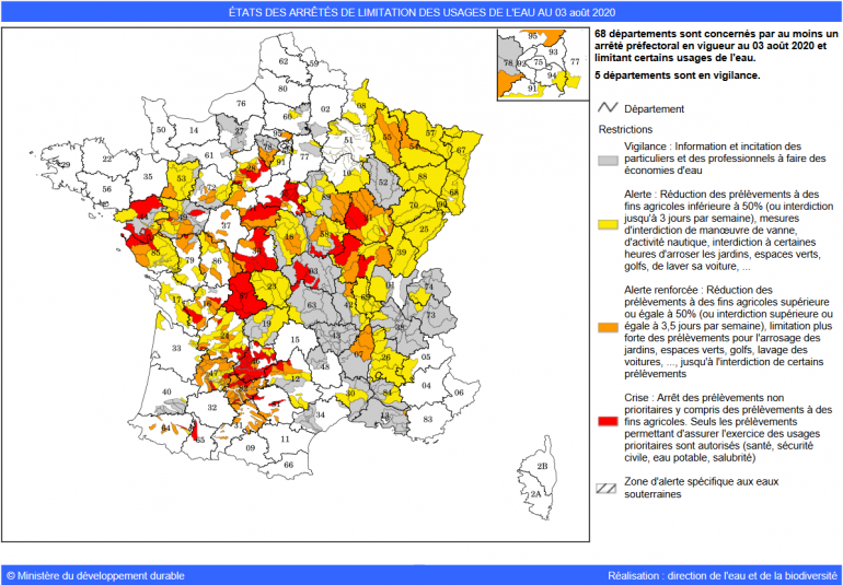 États des arrêtés de limitation des usages de l'eau au 3 août 2020