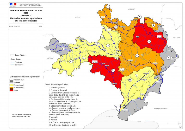 Peu de précipitations et des températures élevées sont prévues pour les prochains jours, le préfet du Gard Didier Lauga a donc décidé de placer les bassins versants du Vidourle, et de la Cèze aval en "crise" (97 communes), le Gardon aval en alerte de niveau 2 (73 communes), 46 communes du bassin versant de la Cèze amont et de la zone Ardèche étant maintenues en alerte de niveau 2.