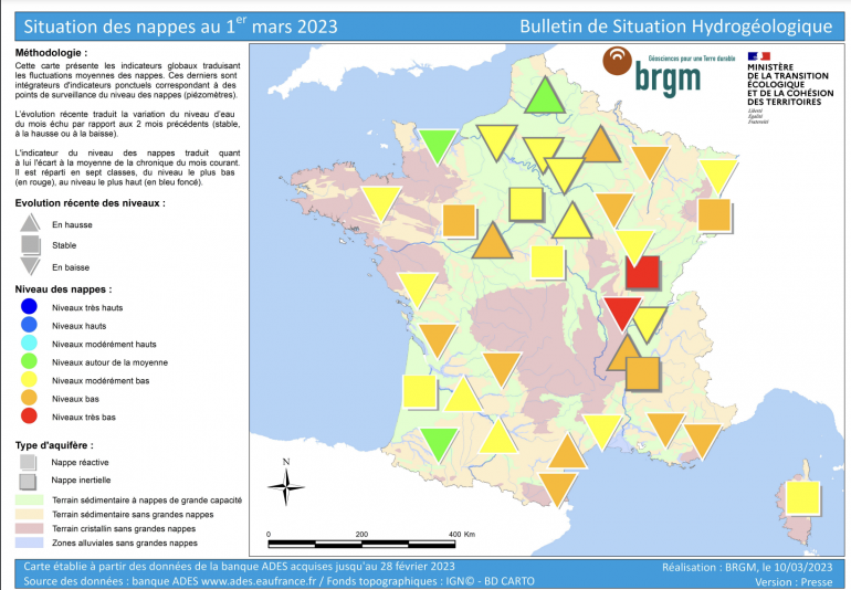Carte de France de la situation des nappes au 1er mars.