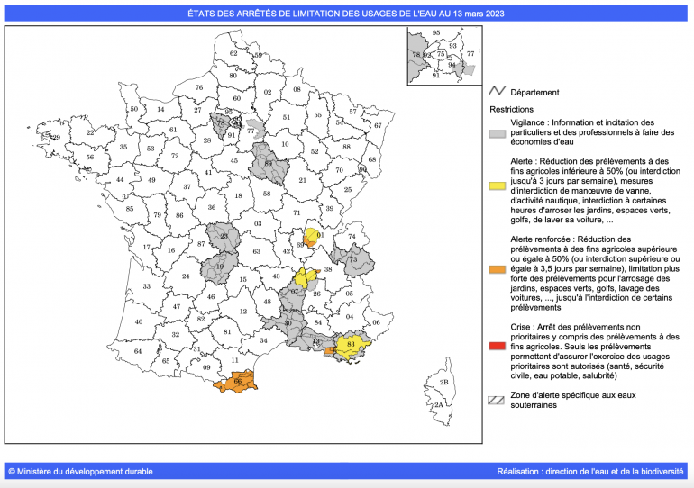 État des arrêtés de limitation de l'usage de l'eau au 13 mars 2023.