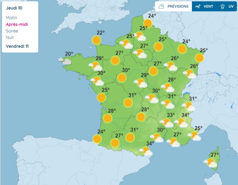 Les températures de l'après-midi du jeudi 10 août 2023.