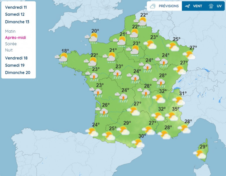 Une ligne orageuse se formera dès dimanche, de la Bourgogne-Franche-Comté à la Nouvelle-Aquitaine, passant par Bourges, Nantes, Tours, ou encore Bordeaux. Celle-ci devrait s'étendre en Île-de-France, en Alsace, et jusqu'à Biarritz et Tarbes dans la soirée.