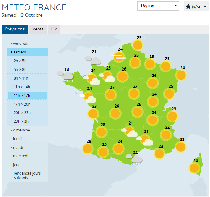 Avec une température moyenne de 18,8 degrés, la journée d'hier a été le jeudi 11 octobre le plus chaud en France depuis le début des relevés météo. Les températures élevées vont se maintenir avec 29 degrés prévus à Mont-de-Marsan samedi 13 octobre et 25 degrés à Montbéliard. Le temps sera ensoleillé sur une très grande partie du pays.