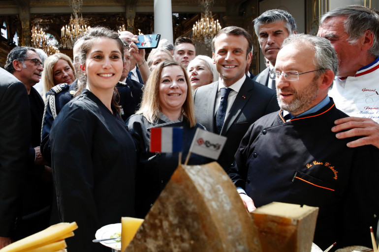 Emmanuel Macron avec des professionnels des métiers de bouche le 1er mai 2019 à l'Élysée