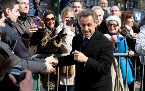 Nicolas Sarkozy a côté de son bureau de vote dans le XVIe arrondissement de Paris dimanche 23 mars 2014