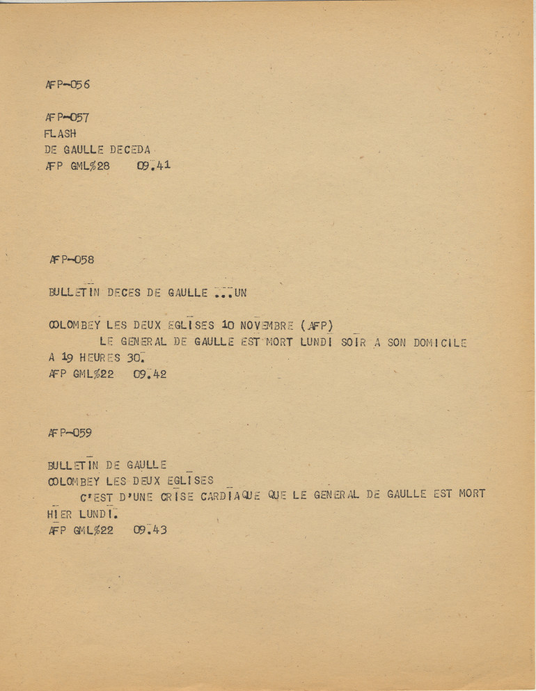 La dépêche AFP du 10 novembre 1970 annonçant la mort du Général de Gaulle la veille