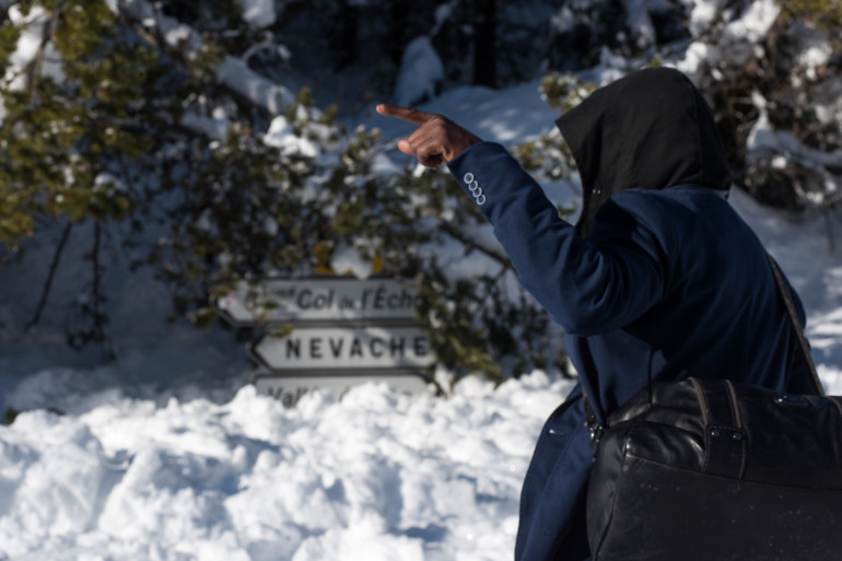 Un migrant ivoirien devant un panneau de signalisation menant au Col de l'Échelle.