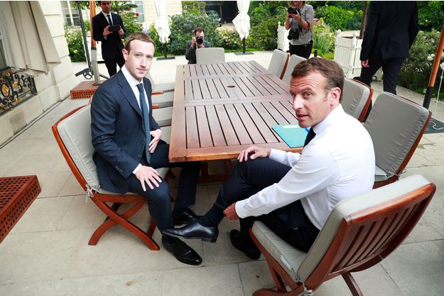 L'homme aux deux milliards d'amis Facebook a eu droit à une rencontre en-tête-à-tête en fin de journée, sur la terrasse de l'Élysée baignée par le soleil. Autour de la table de jardin, Mark Zuckerberg, engoncé dans son costume cravate, écoute Emmanuel Macron à l'aise, en bras de chemise, dossier bleu posé devant lui.