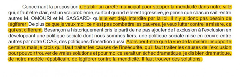 "Ce que je veux moi, ce n’est pas combattre les pauvres, je veux lutter contre la misère", affirmait Jean-Louis Fousseret. "Peut-être que la vue de la misère insupporte certains", notait-il, invitant plutôt à "trouver des solutions" qu'à légiférer. "Pour moi ce serait un échec dramatique, je dis bien dramatique, de notre modèle républicain, de légiférer contre la mendicité."