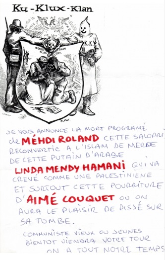 Connus pour leurs actions contre la politique de Robert Ménard, l'élu communiste de Béziers, Aimé Couquet et les deux militants Linda Mendy-Hamdani et Mehdi Roland ont reçu une lettre de menaces de mort, rapporte samedi 24 octobre Midi Libre. Envoyé au siège du Parti communiste biterrois le 21 octobre, le courrier, insultant et truffé de fautes d'orthographe, affiche une du Klu Klux Klan en en-tête.