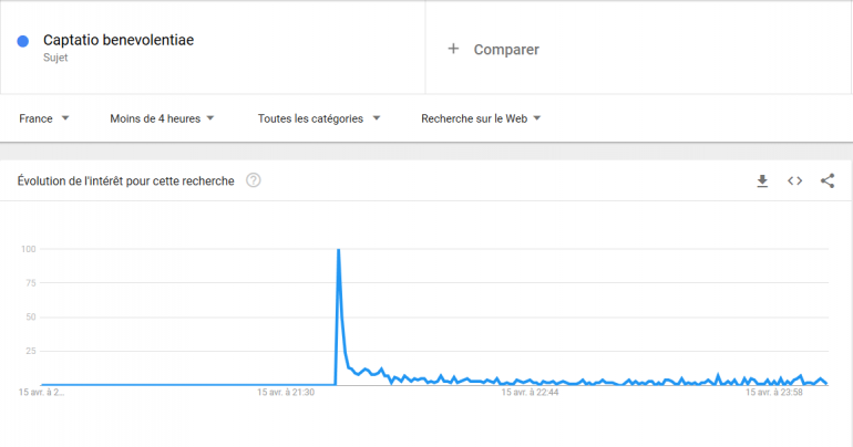 Les recherches Google de l'expression "Captatio benevolentiae" dans la soirée du 15 avril 2018
