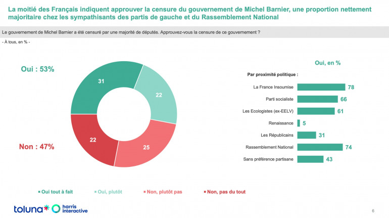 Quelles sont les réactions des Français après la censure du gouvernement de Michel Barnier ? Selon un sondage Toluna Harris Interactive pour RTL, une petite majorité des Français, 53%, indiquent approuver cette censure. Ils sont nombreux à l'approuver notamment chez les sympathisants des partis de gauche (78% pour LFI, 66% pour le PS et 61% pour les écologistes) et du Rassemblement national (74%).