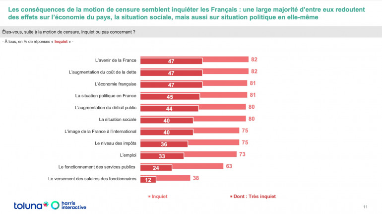 Pour autant, une large majorité des Français sondés sont inquiets concernant les conséquences de la motion de censure : des effets sur l’économie du pays, la situation sociale, mais aussi sur situation politique en elle-même. 82% se disent inquiets pour l’avenir de la France en général, 81% le son pour l’économie française, 80% sont inquiets pour l’augmentation du déficit public.