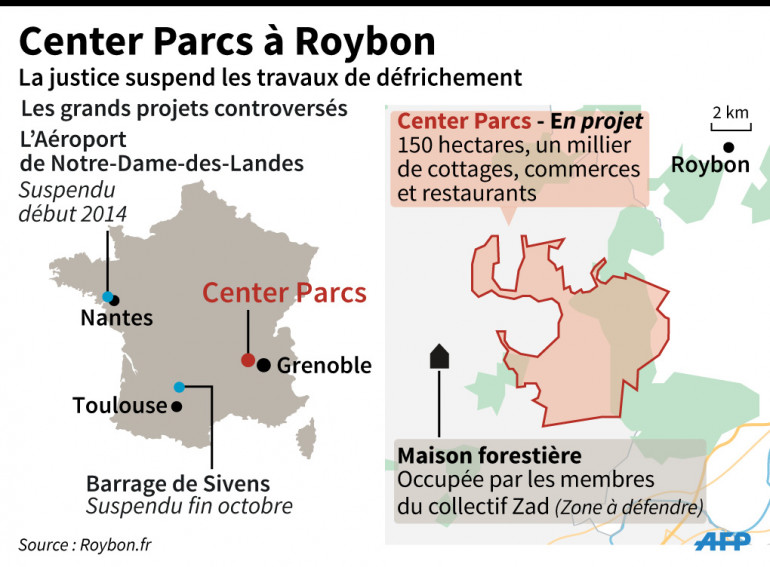 Le projet de Center Parcs de Roybon prévoit la construction d'un millier de cottages autour d'une bulle aquatique tropicale au cœur de la forêt de Chambaran. Il pourra accueillir 5.628 personnes et doit permettre la création de 697 emplois, soit 468 postes "équivalent temps plein".
