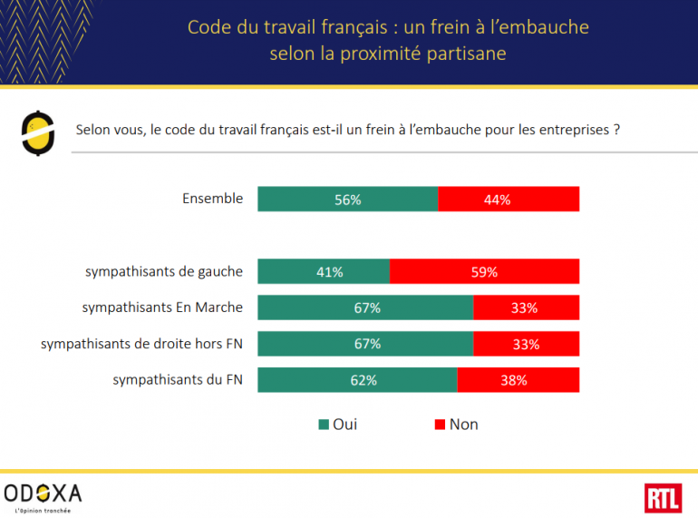 Seuls les sympathisants de gauche sont majoritairement réfractaires à cette vision. Seulement 41% estiment que le Code du travail ne facilite pas les embauches.