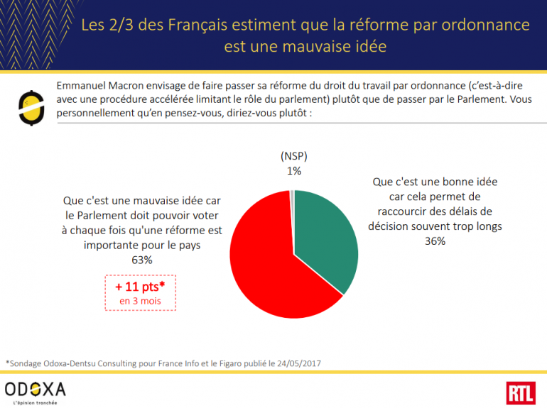 Ce plafonnement passera par ordonnance, et c'est là encore un problème pour beaucoup de Français. Les ordonnances permettent de faire passer une loi plus rapidement, mais cela implique des discussions a minima avec les partenaires sociaux et un rôle limité du Parlement. Pour 63% des sondés, le recours aux ordonnances pour effectuer cette réforme est une mauvaise idée. Et la part de ceux qui le pensent a progressé de 11 point depuis mai dernier.