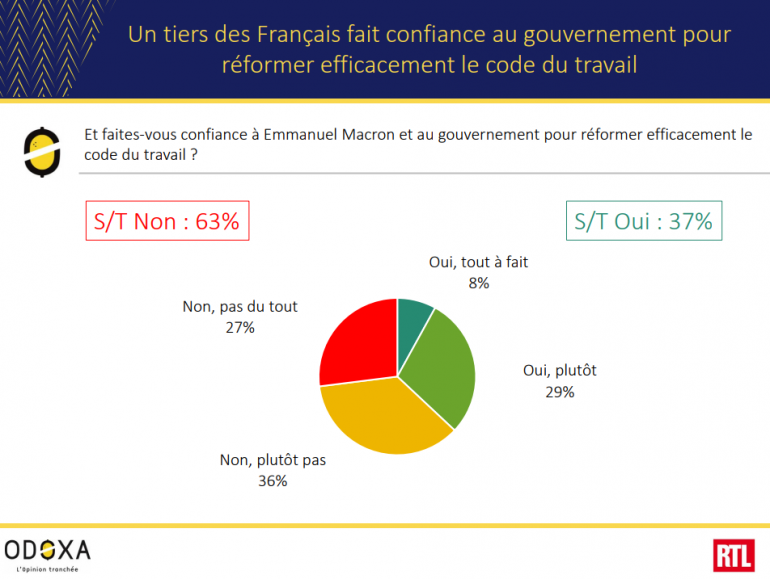 Ils sont en revanche 63% à ne pas faire confiance à Emmanuel Macron et au gouvernement pour réformer efficacement le Code du travail