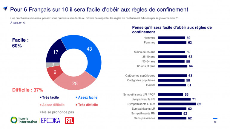 73 % des Français se disent inquiets pour leur santé et celle de leurs proches, dont 27 % sont très inquiets. Une inquiétude qui touche plus les seniors (82 % des plus de 65 ans). 60 % des Français estiment qu'il sera facile de suivre le confinement.